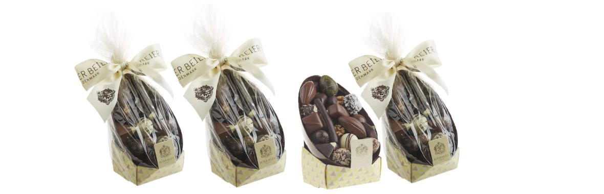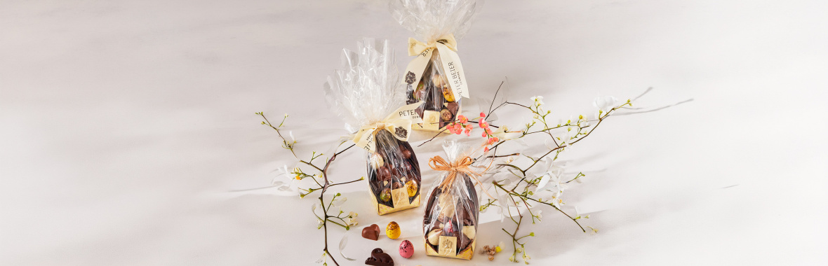 Chocolate shells filled to the brim with Peter Beier pralines and Quail eggs, wrapped in cellophane and finished with a bow.